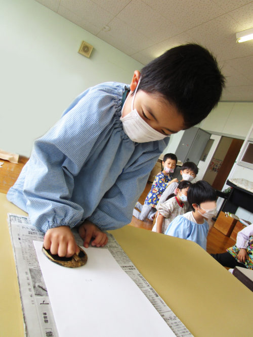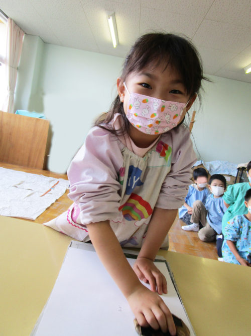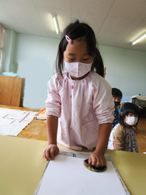 年中組さんと年長組さんは、それぞれ版画に取り組みました。