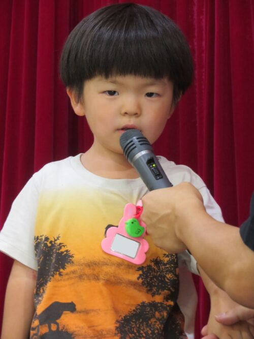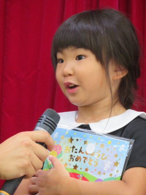 担任の先生からお誕生カードを受け取った後はインタビューを行い、好きな食べ物や好きな遊びをお話してくれました。