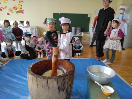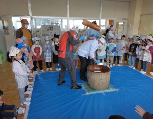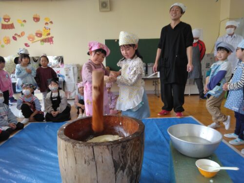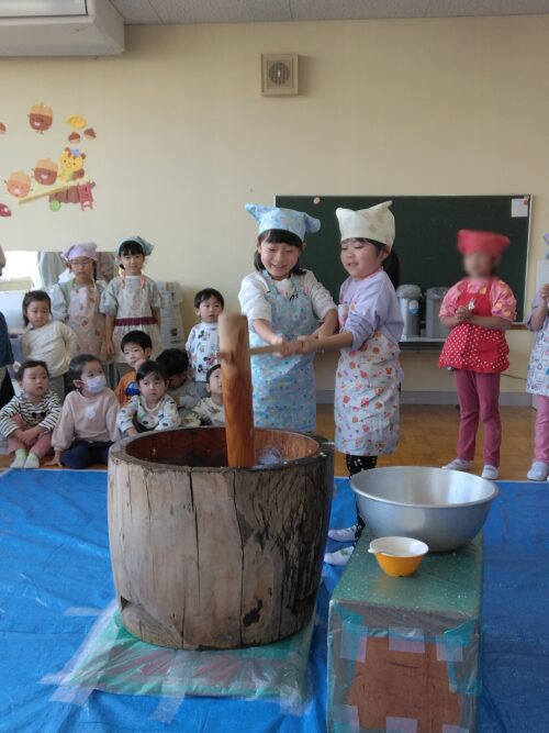 もちつきが始まると、「よいしょー!」と元気いっぱいに掛け声をかけ、とてもにぎやかな雰囲気に包まれました。