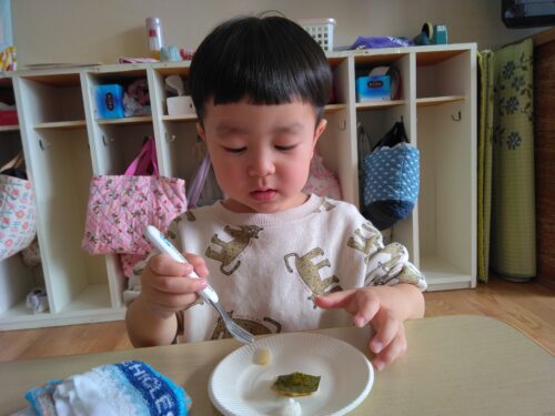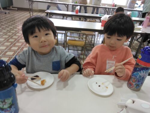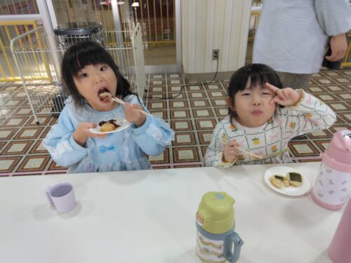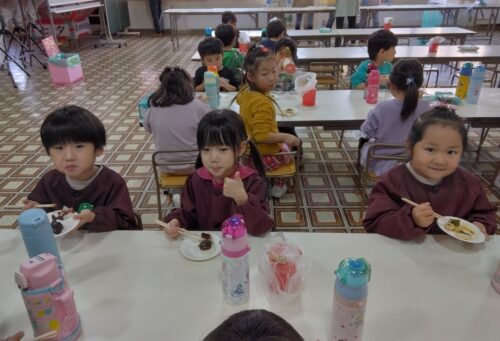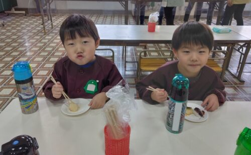 つきたてのおもちは温かく、ふわっとやわらかく、子ども達は自分の好きな味を選んで食べました。たくさんおかわりをする子もいました😊