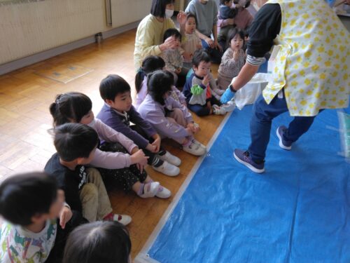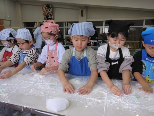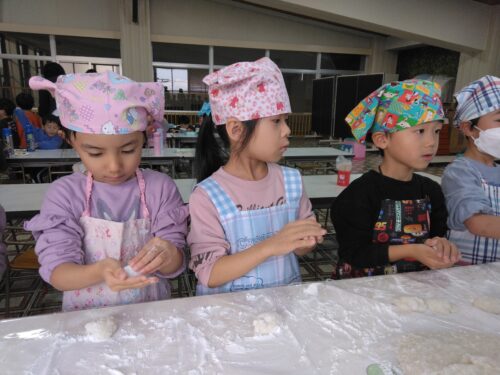 おもちを丸める作業では、片栗粉を付けすぎると丸くならなかったり、力を入れすぎると形が崩れてしまったり、見た目以上に難しい作業に苦戦する子もいましたが、それでも自分の手で丸めたおもちは特別で「できた!」と満足気な笑顔がたくさん見られました💕