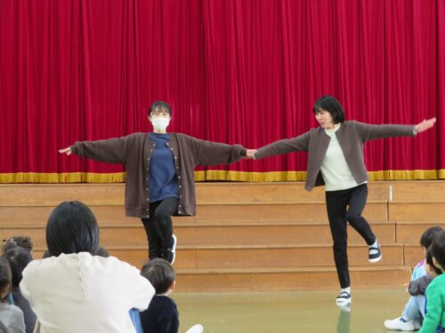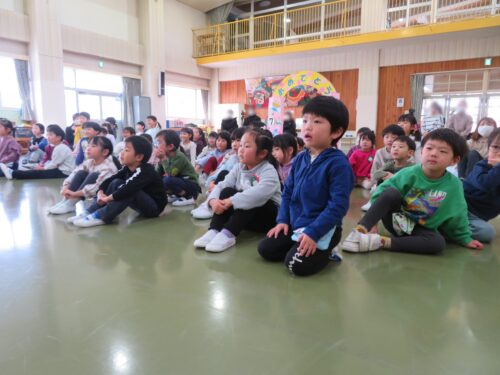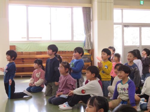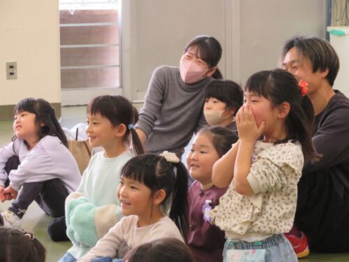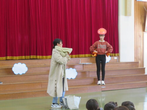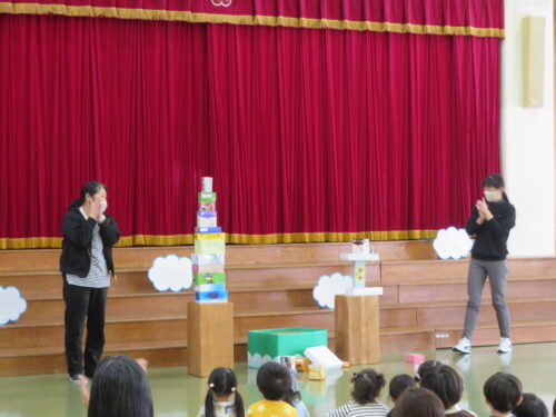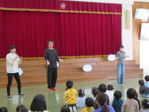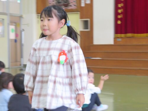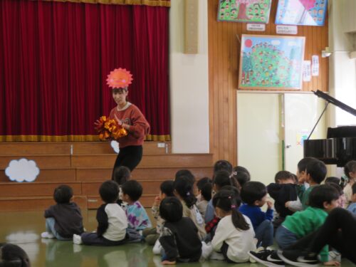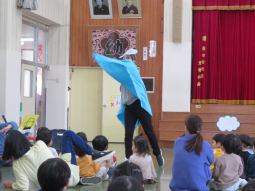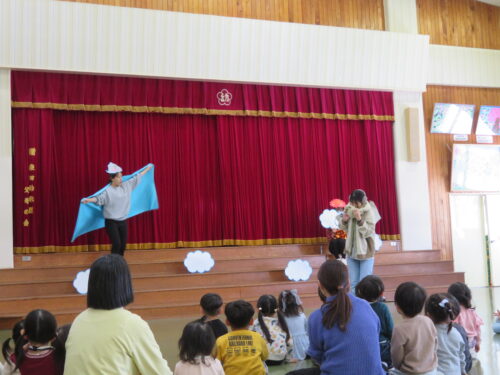 その後のお楽しみ「北風と太陽」の劇では、旅人の洋服を脱がせようと、北風と太陽の比べっこに、子ども達も目をキラキラさせて見ていました。
