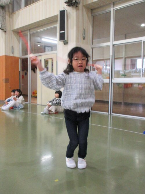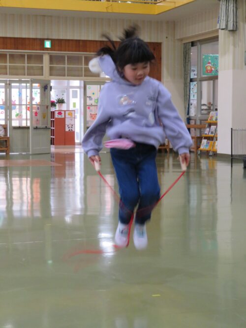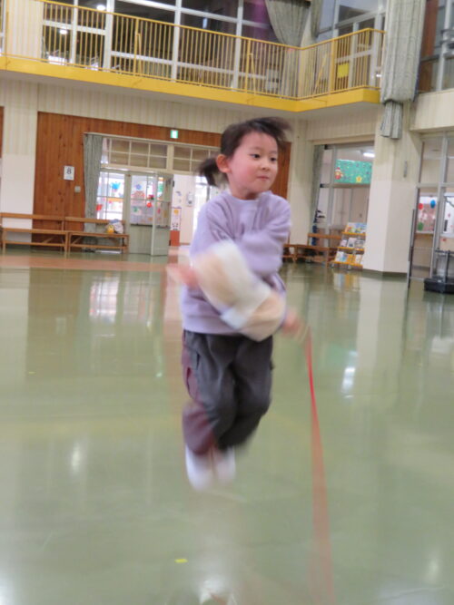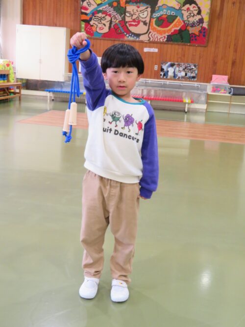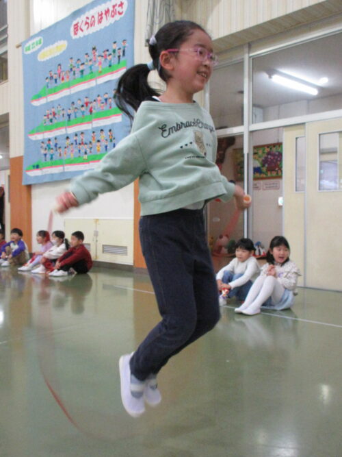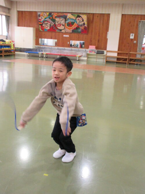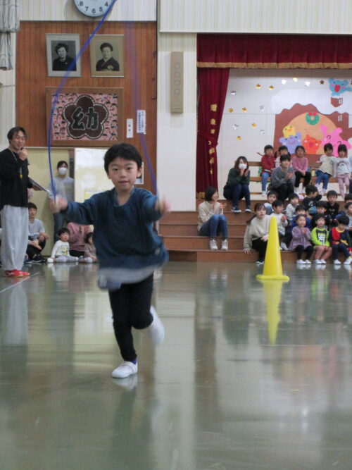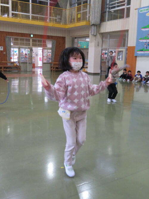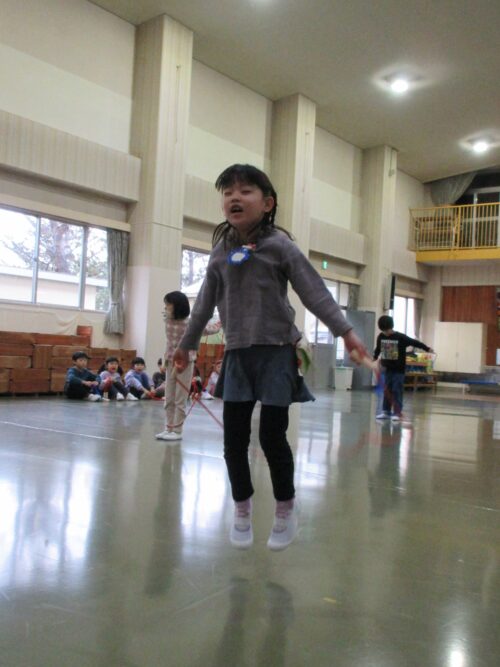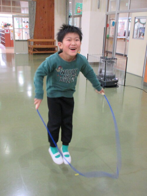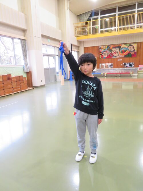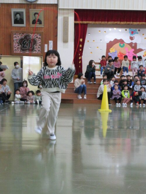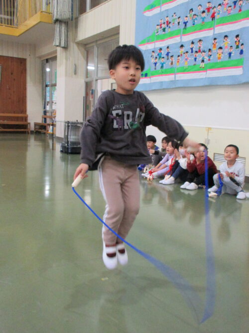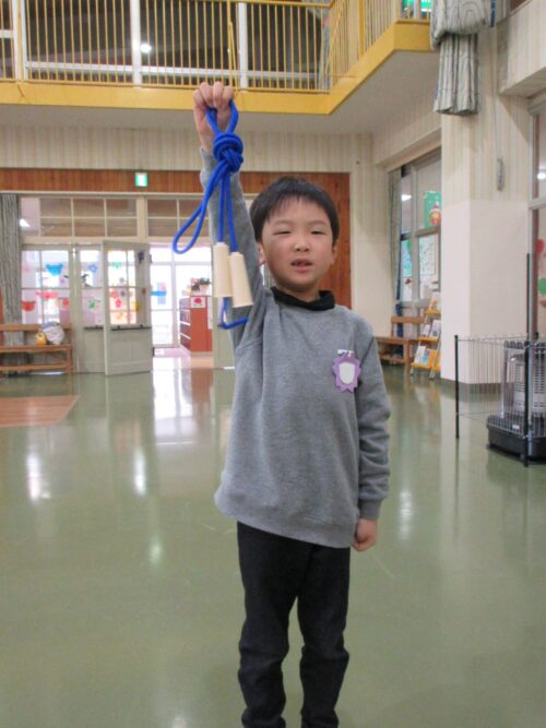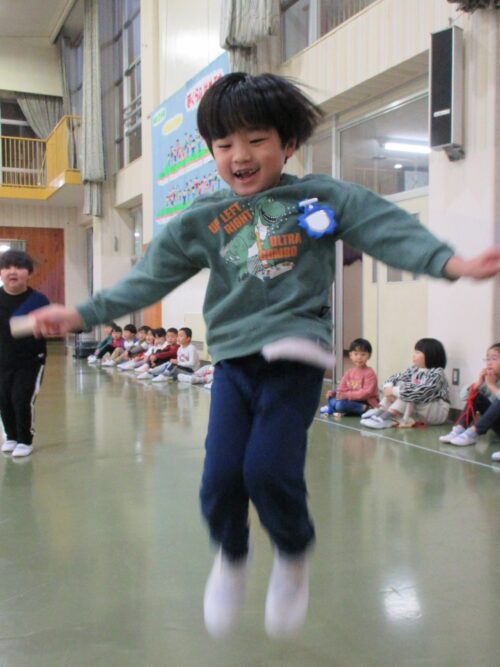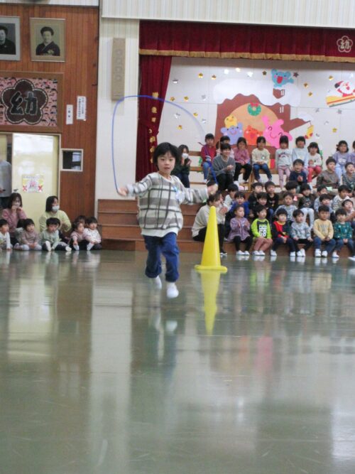 まえとび、うしろとび、かたあしとび、あやとびなど色々な技に挑戦する姿は、とても頼もしく緊張しながらも堂々と頑張る子ども達に、大きな拍手が送られました。なわとびをとぶのもそうですが、結ぶのも上手な年長組さんでした😄