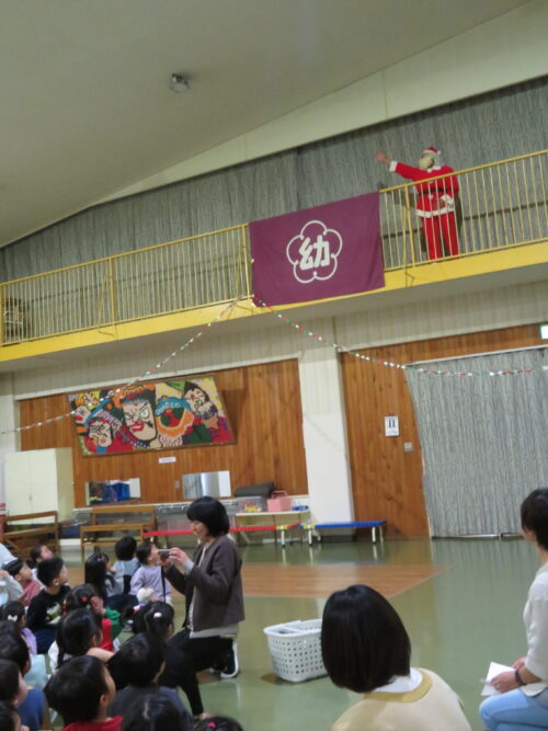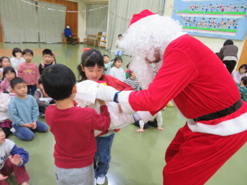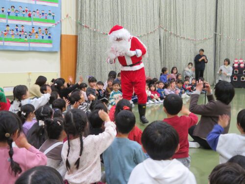 「もっと近くに来て下さ~い!」とお願いすると、あっという間にステージへ!ステージに来てくれたサンタさんに、子ども達は大喜び!